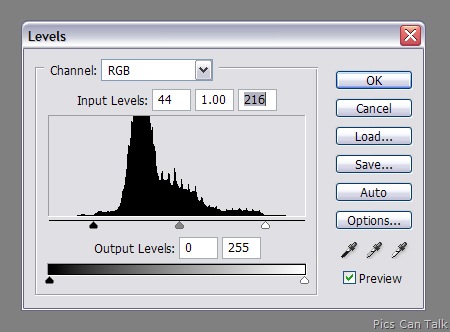 Move the slider on both ends to the edge of the histogram where there are tonal details. You can see the change in your picture instantaneously as the contrast level improves.